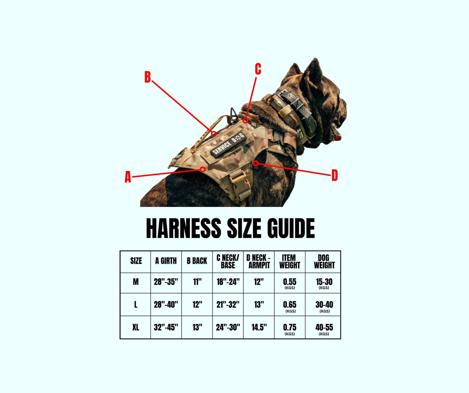 Measurement A: The circumference from mid-stomach around the back to mid-stomach. Measurement B: The length from the bottom of your PUP's neck to mid-back. Measurement C: The circumference around the lower neck. Measurement D: The length from your PUP's lower neck to the armpit.